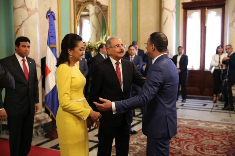 De manera entusiasta y con evidente alegría, el presidente Danilo Medina y la primera dama de la República, Cándida Montilla de Medina, recibieron los saludos de Año Nuevo, en una ceremonia que tuvo lugar en el Salón de Embajadores del Palacio Nacional.