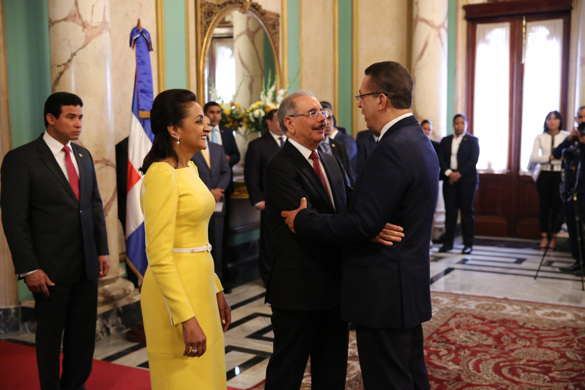 De manera entusiasta y con evidente alegría, el presidente Danilo Medina y la primera dama de la República, Cándida Montilla de Medina, recibieron los saludos de Año Nuevo, en una ceremonia que tuvo lugar en el Salón de Embajadores del Palacio Nacional.