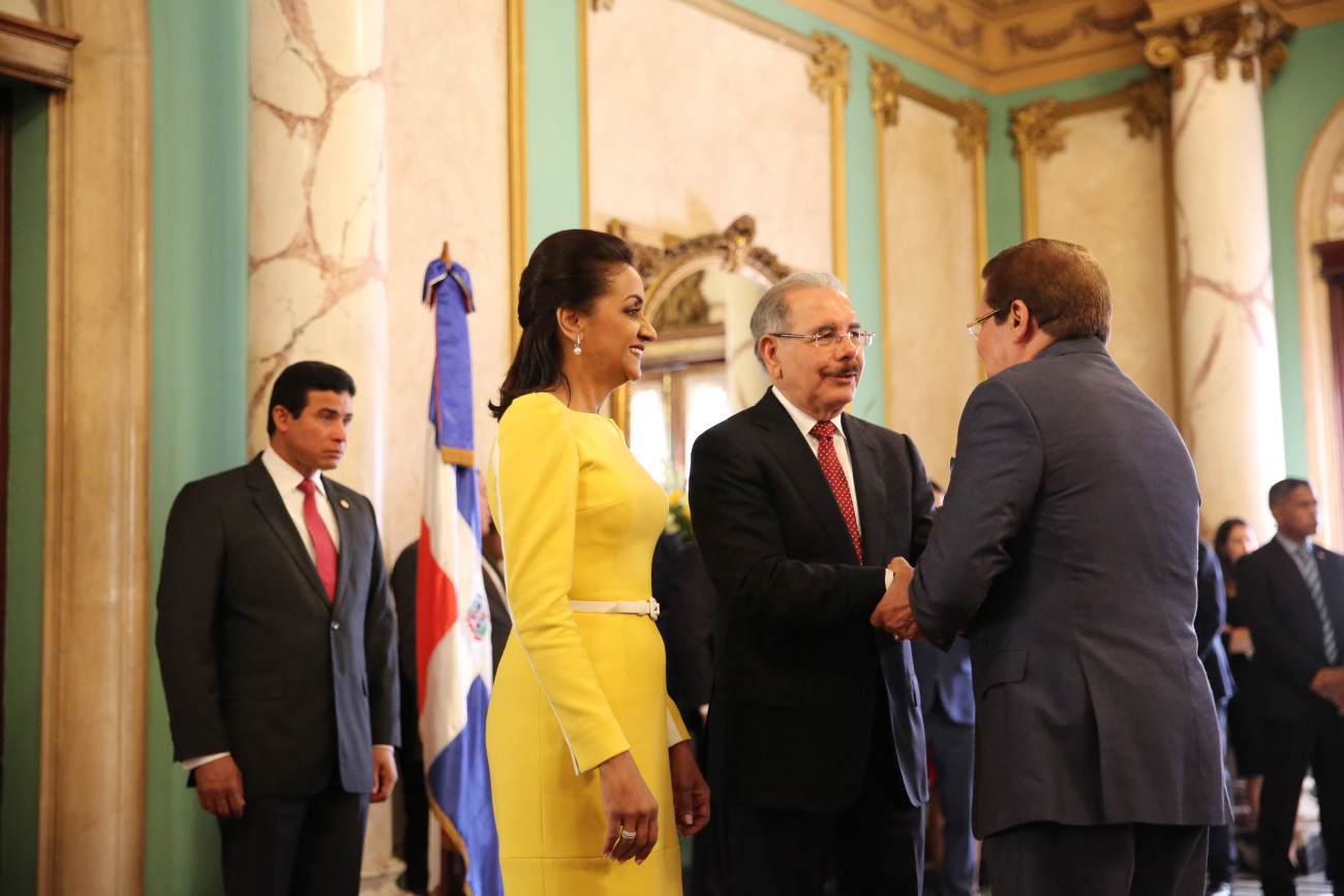 De manera entusiasta y con evidente alegría, el presidente Danilo Medina y la primera dama de la República, Cándida Montilla de Medina, recibieron los saludos de Año Nuevo, en una ceremonia que tuvo lugar en el Salón de Embajadores del Palacio Nacional.