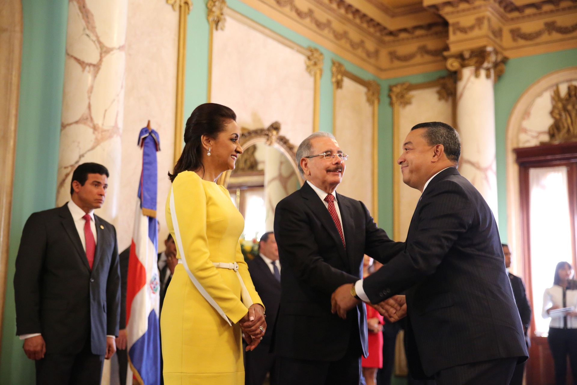De manera entusiasta y con evidente alegría, el presidente Danilo Medina y la primera dama de la República, Cándida Montilla de Medina, recibieron los saludos de Año Nuevo, en una ceremonia que tuvo lugar en el Salón de Embajadores del Palacio Nacional.