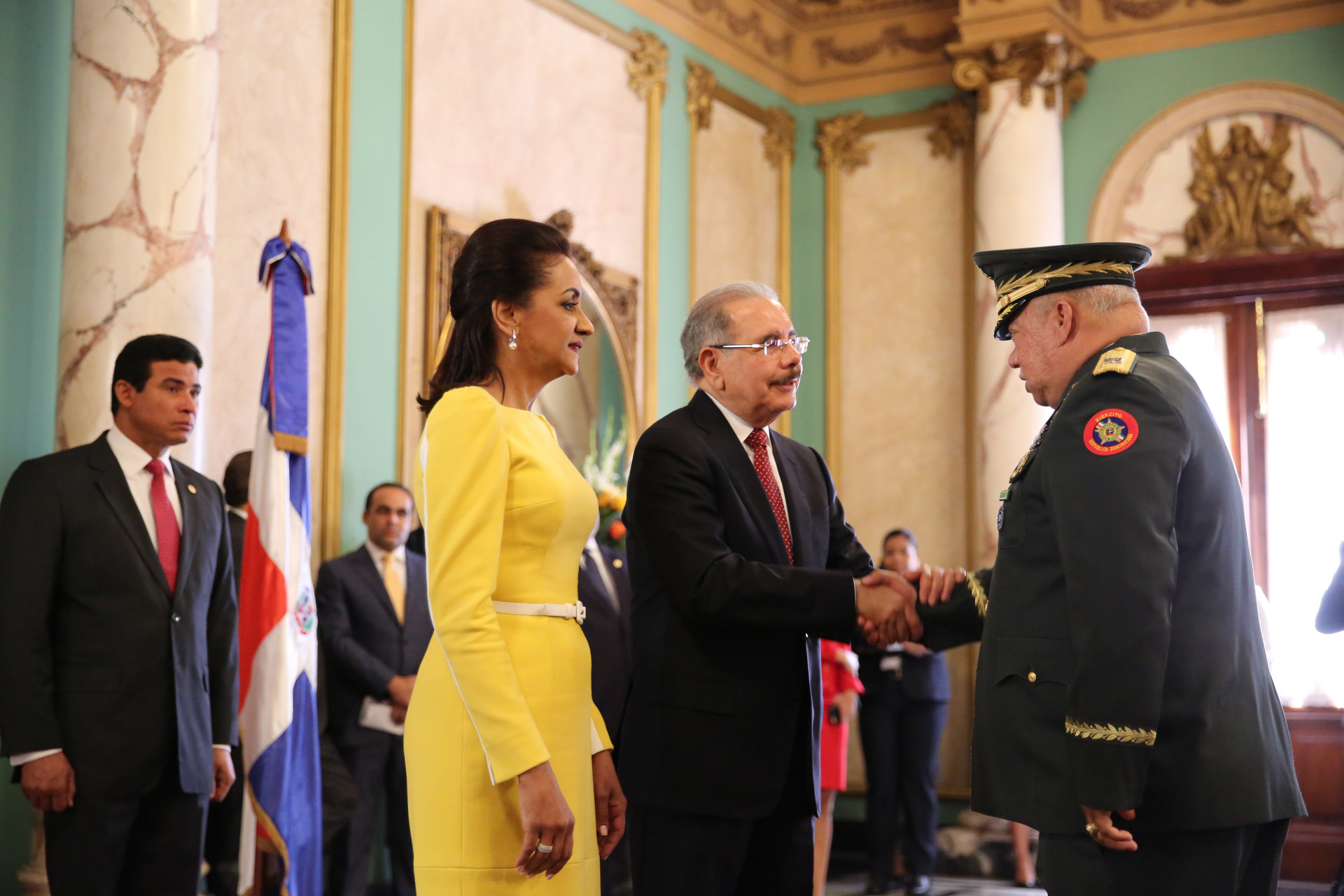 De manera entusiasta y con evidente alegría, el presidente Danilo Medina y la primera dama de la República, Cándida Montilla de Medina, recibieron los saludos de Año Nuevo, en una ceremonia que tuvo lugar en el Salón de Embajadores del Palacio Nacional.