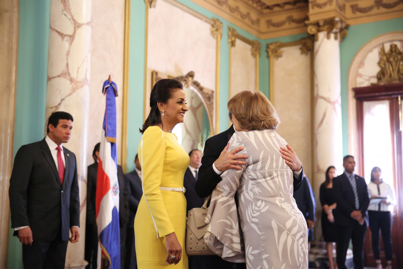 De manera entusiasta y con evidente alegría, el presidente Danilo Medina y la primera dama de la República, Cándida Montilla de Medina, recibieron los saludos de Año Nuevo, en una ceremonia que tuvo lugar en el Salón de Embajadores del Palacio Nacional.