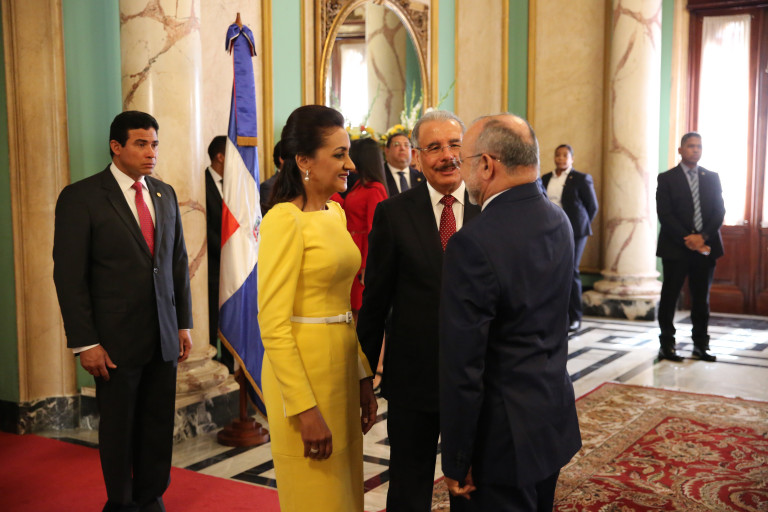 De manera entusiasta y con evidente alegría, el presidente Danilo Medina y la primera dama de la República, Cándida Montilla de Medina, recibieron los saludos de Año Nuevo, en una ceremonia que tuvo lugar en el Salón de Embajadores del Palacio Nacional.
