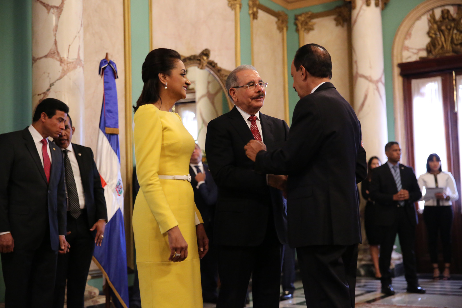De manera entusiasta y con evidente alegría, el presidente Danilo Medina y la primera dama de la República, Cándida Montilla de Medina, recibieron los saludos de Año Nuevo, en una ceremonia que tuvo lugar en el Salón de Embajadores del Palacio Nacional.