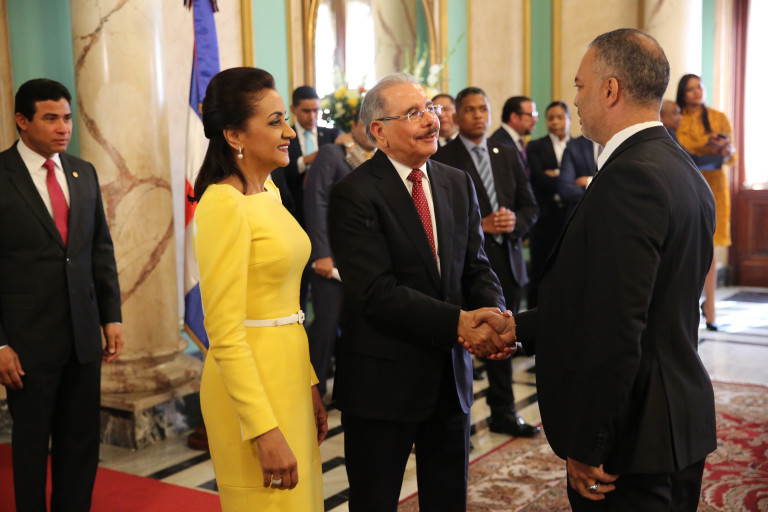 De manera entusiasta y con evidente alegría, el presidente Danilo Medina y la primera dama de la República, Cándida Montilla de Medina, recibieron los saludos de Año Nuevo, en una ceremonia que tuvo lugar en el Salón de Embajadores del Palacio Nacional.