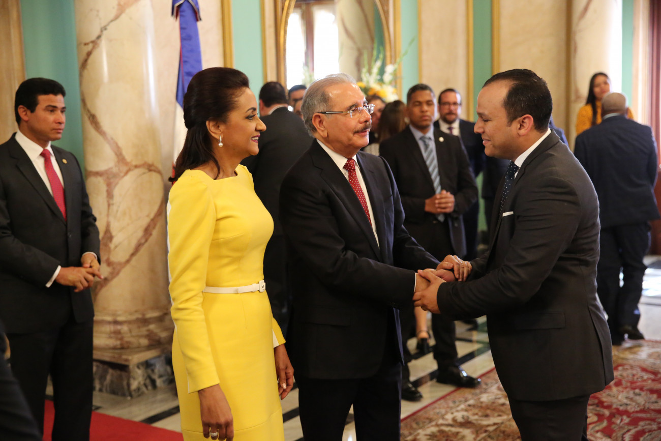 De manera entusiasta y con evidente alegría, el presidente Danilo Medina y la primera dama de la República, Cándida Montilla de Medina, recibieron los saludos de Año Nuevo, en una ceremonia que tuvo lugar en el Salón de Embajadores del Palacio Nacional.