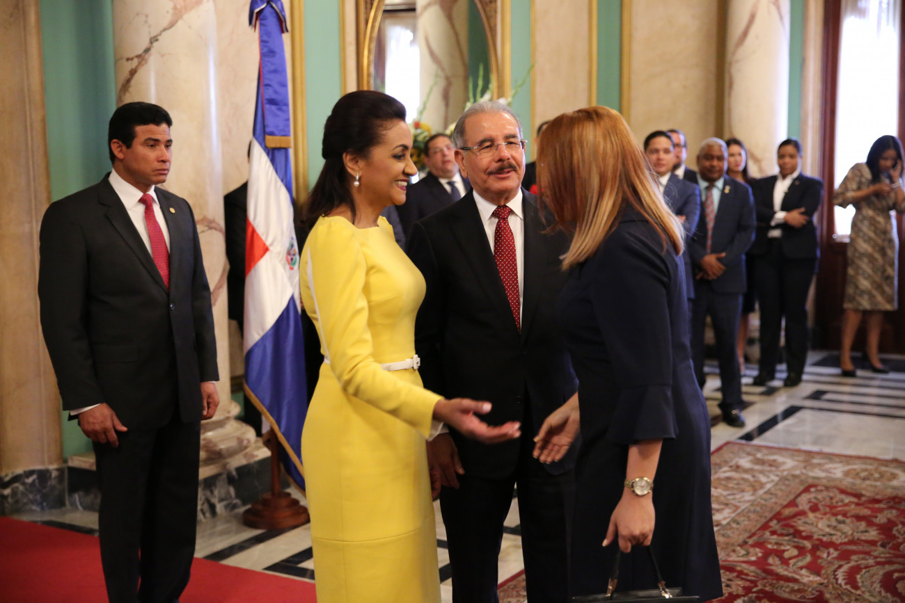 De manera entusiasta y con evidente alegría, el presidente Danilo Medina y la primera dama de la República, Cándida Montilla de Medina, recibieron los saludos de Año Nuevo, en una ceremonia que tuvo lugar en el Salón de Embajadores del Palacio Nacional.