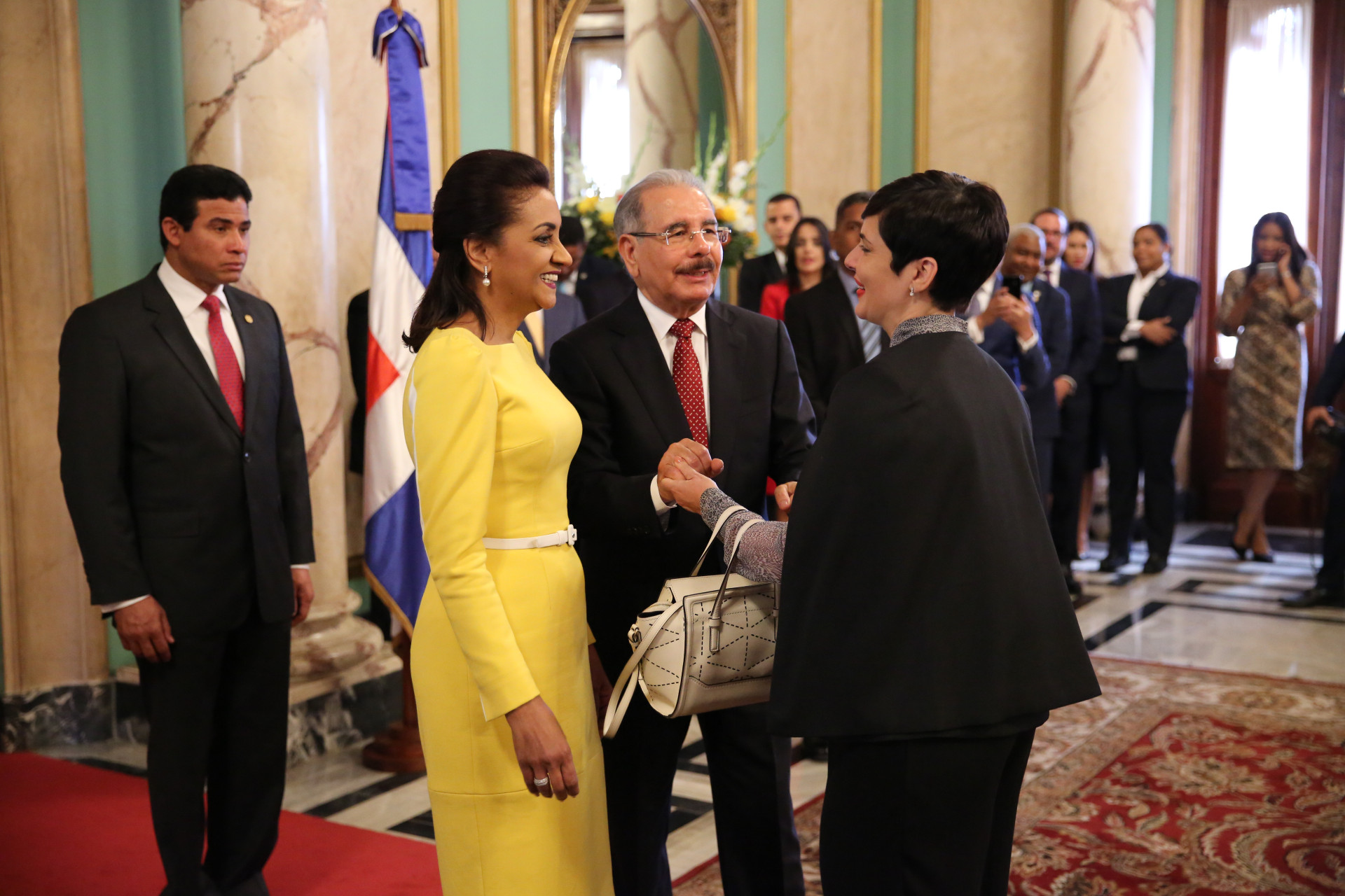 De manera entusiasta y con evidente alegría, el presidente Danilo Medina y la primera dama de la República, Cándida Montilla de Medina, recibieron los saludos de Año Nuevo, en una ceremonia que tuvo lugar en el Salón de Embajadores del Palacio Nacional.