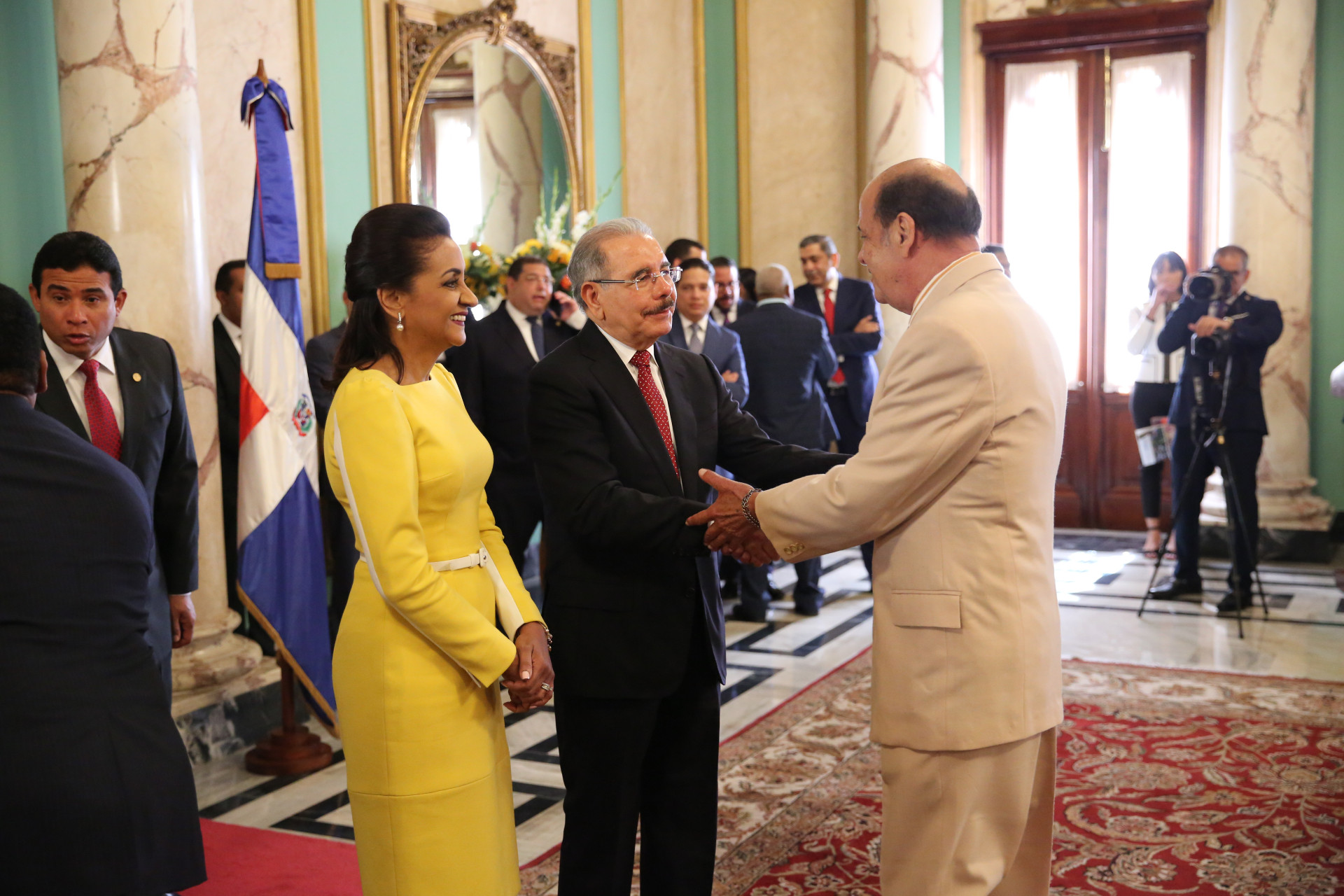 De manera entusiasta y con evidente alegría, el presidente Danilo Medina y la primera dama de la República, Cándida Montilla de Medina, recibieron los saludos de Año Nuevo, en una ceremonia que tuvo lugar en el Salón de Embajadores del Palacio Nacional.