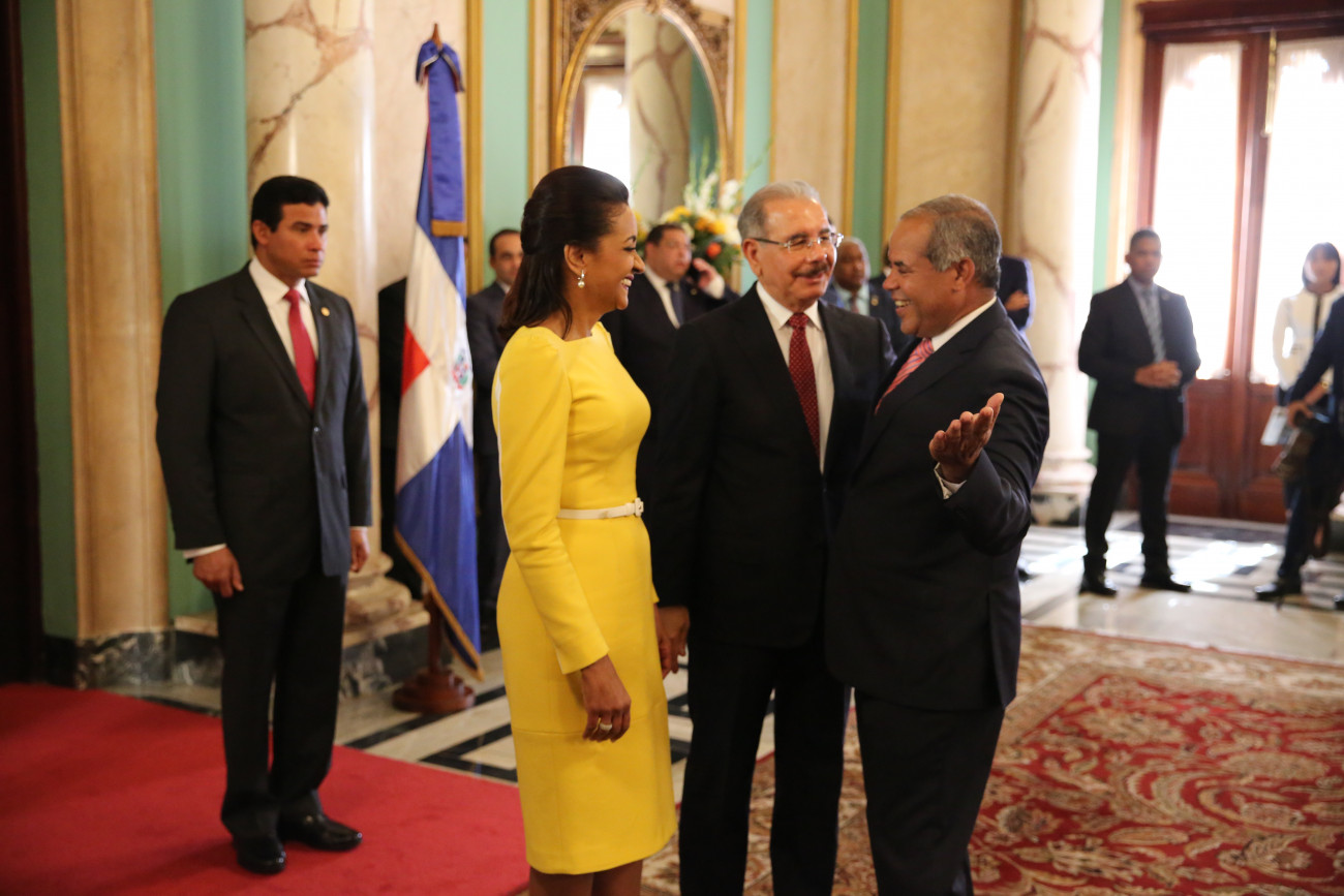 De manera entusiasta y con evidente alegría, el presidente Danilo Medina y la primera dama de la República, Cándida Montilla de Medina, recibieron los saludos de Año Nuevo, en una ceremonia que tuvo lugar en el Salón de Embajadores del Palacio Nacional.