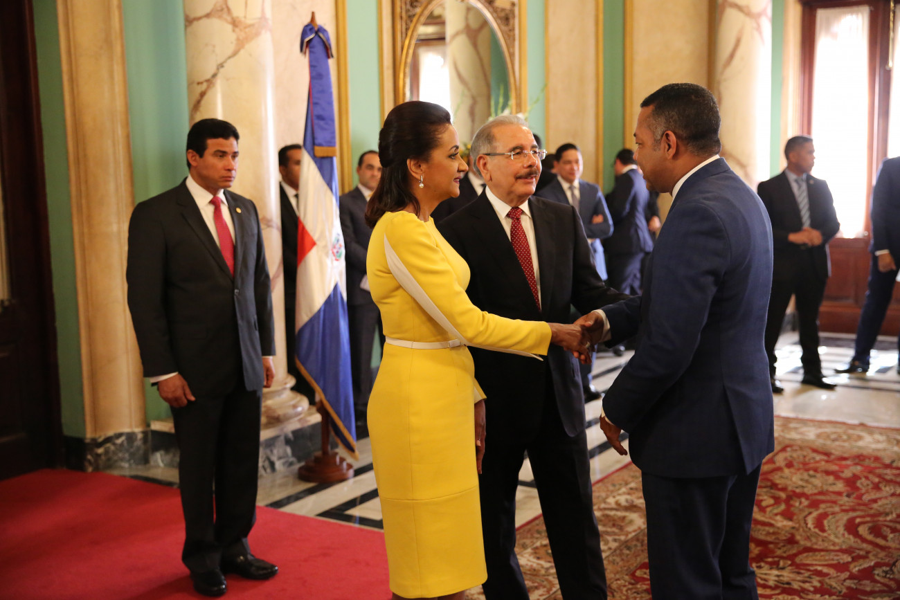 De manera entusiasta y con evidente alegría, el presidente Danilo Medina y la primera dama de la República, Cándida Montilla de Medina, recibieron los saludos de Año Nuevo, en una ceremonia que tuvo lugar en el Salón de Embajadores del Palacio Nacional.