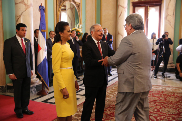 De manera entusiasta y con evidente alegría, el presidente Danilo Medina y la primera dama de la República, Cándida Montilla de Medina, recibieron los saludos de Año Nuevo, en una ceremonia que tuvo lugar en el Salón de Embajadores del Palacio Nacional.