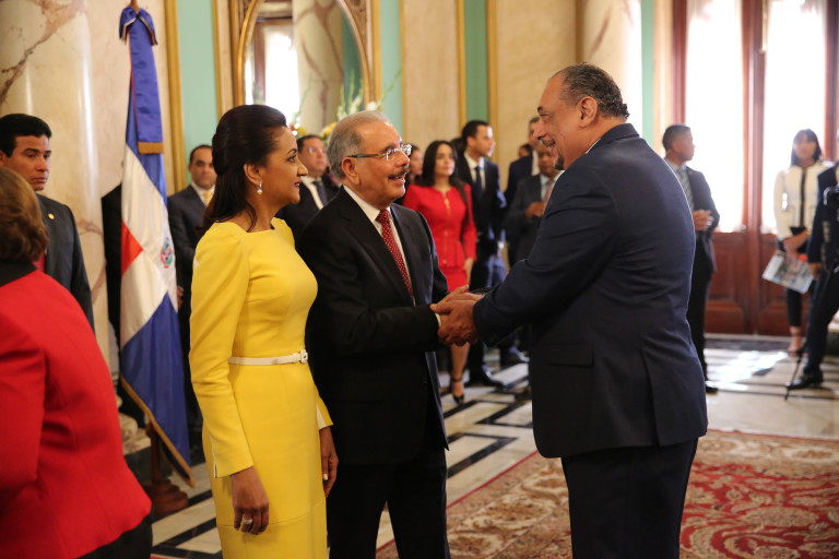 De manera entusiasta y con evidente alegría, el presidente Danilo Medina y la primera dama de la República, Cándida Montilla de Medina, recibieron los saludos de Año Nuevo, en una ceremonia que tuvo lugar en el Salón de Embajadores del Palacio Nacional.