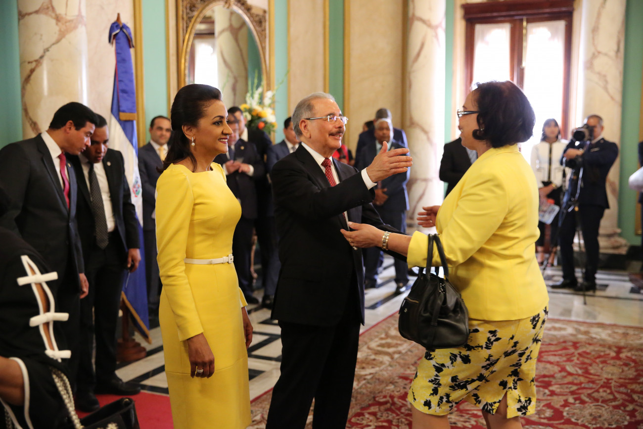 De manera entusiasta y con evidente alegría, el presidente Danilo Medina y la primera dama de la República, Cándida Montilla de Medina, recibieron los saludos de Año Nuevo, en una ceremonia que tuvo lugar en el Salón de Embajadores del Palacio Nacional.