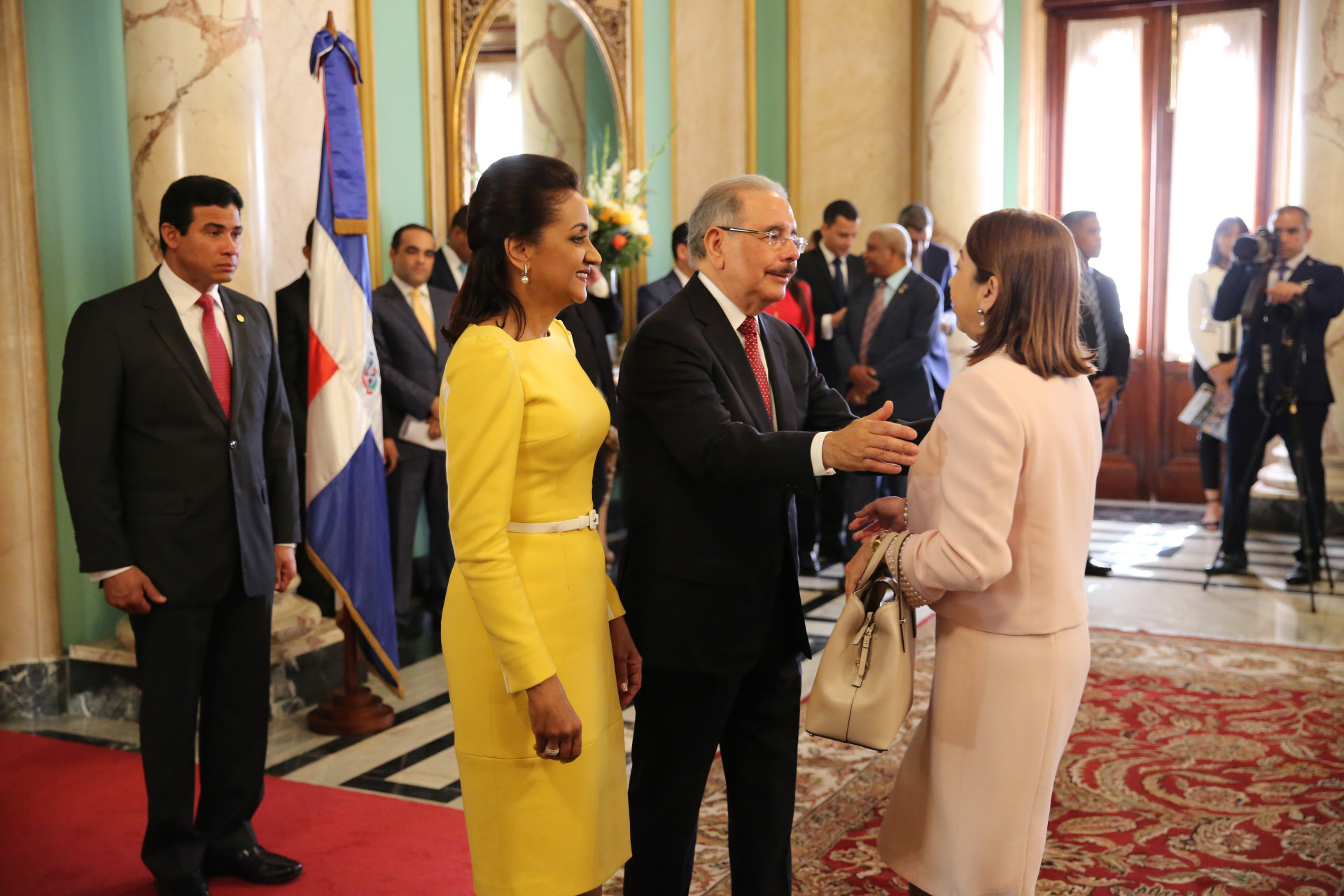 De manera entusiasta y con evidente alegría, el presidente Danilo Medina y la primera dama de la República, Cándida Montilla de Medina, recibieron los saludos de Año Nuevo, en una ceremonia que tuvo lugar en el Salón de Embajadores del Palacio Nacional.