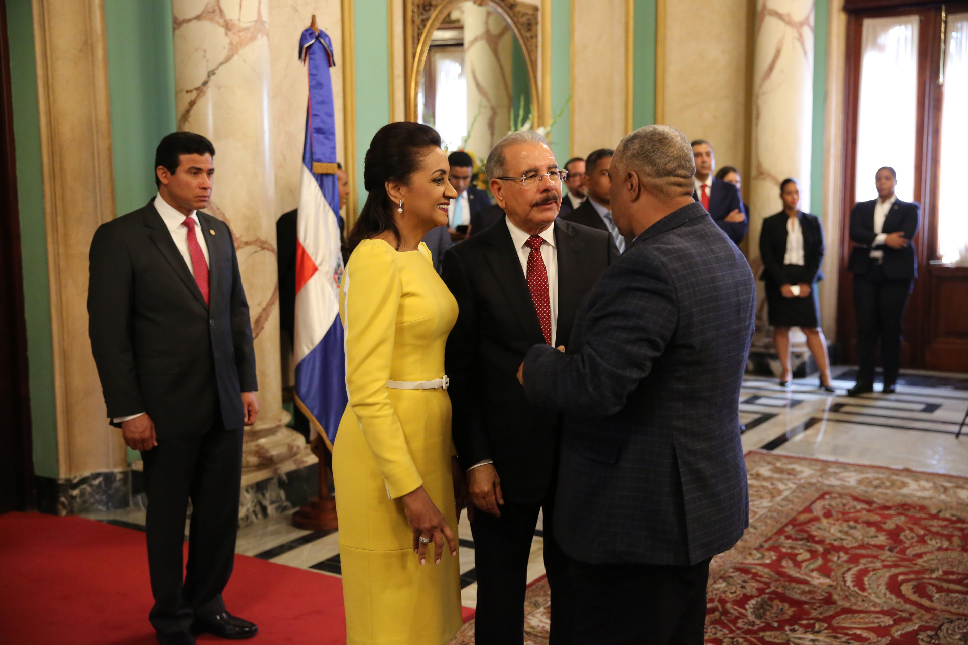 De manera entusiasta y con evidente alegría, el presidente Danilo Medina y la primera dama de la República, Cándida Montilla de Medina, recibieron los saludos de Año Nuevo, en una ceremonia que tuvo lugar en el Salón de Embajadores del Palacio Nacional.