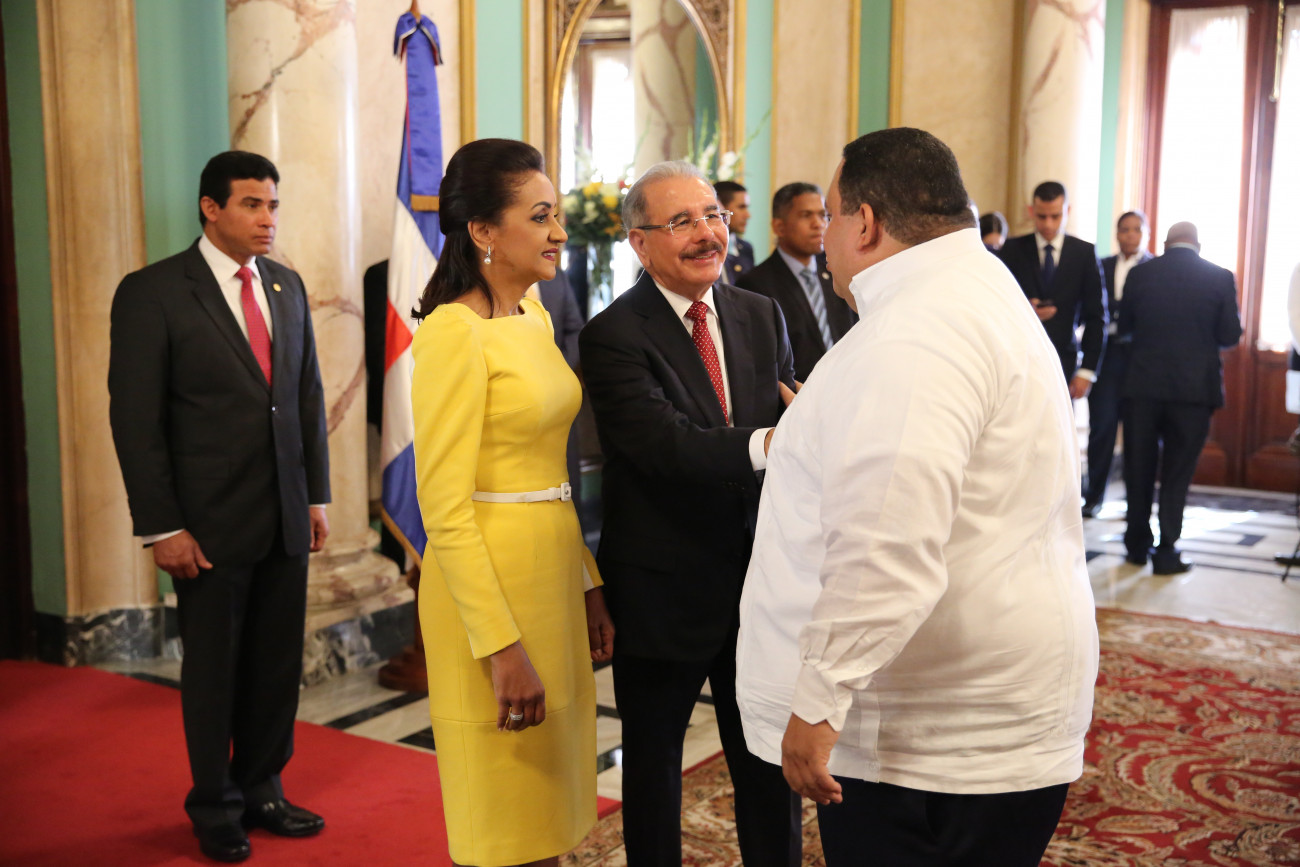 De manera entusiasta y con evidente alegría, el presidente Danilo Medina y la primera dama de la República, Cándida Montilla de Medina, recibieron los saludos de Año Nuevo, en una ceremonia que tuvo lugar en el Salón de Embajadores del Palacio Nacional.