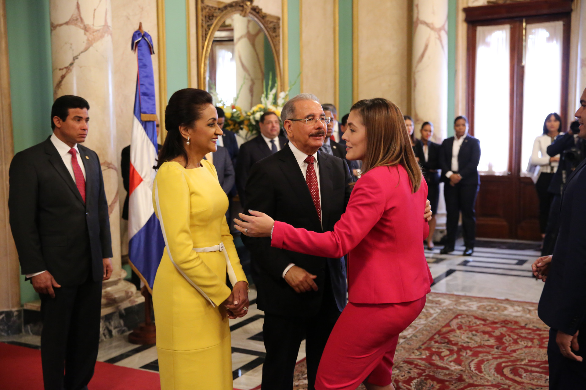 De manera entusiasta y con evidente alegría, el presidente Danilo Medina y la primera dama de la República, Cándida Montilla de Medina, recibieron los saludos de Año Nuevo, en una ceremonia que tuvo lugar en el Salón de Embajadores del Palacio Nacional.