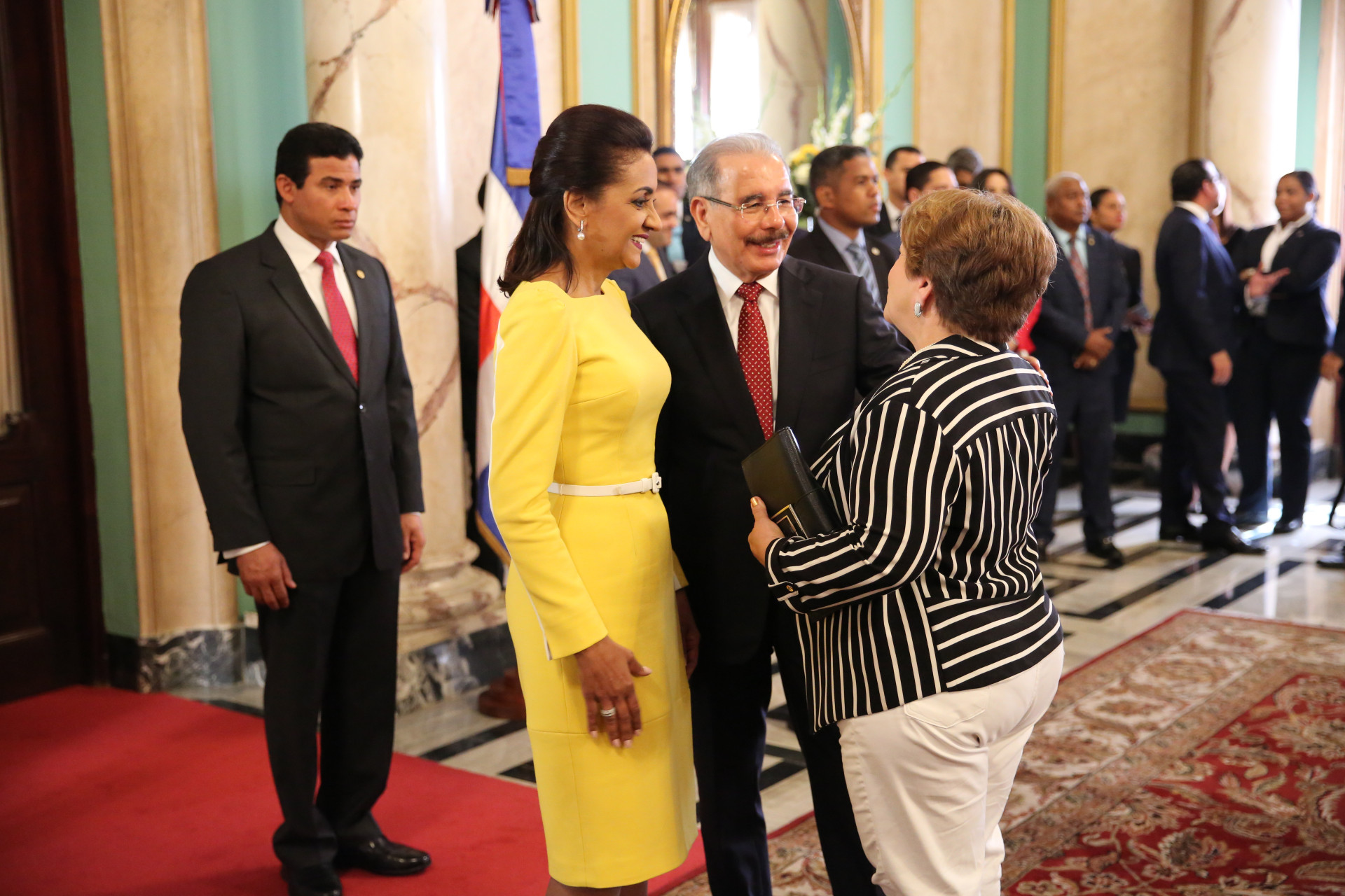 De manera entusiasta y con evidente alegría, el presidente Danilo Medina y la primera dama de la República, Cándida Montilla de Medina, recibieron los saludos de Año Nuevo, en una ceremonia que tuvo lugar en el Salón de Embajadores del Palacio Nacional.