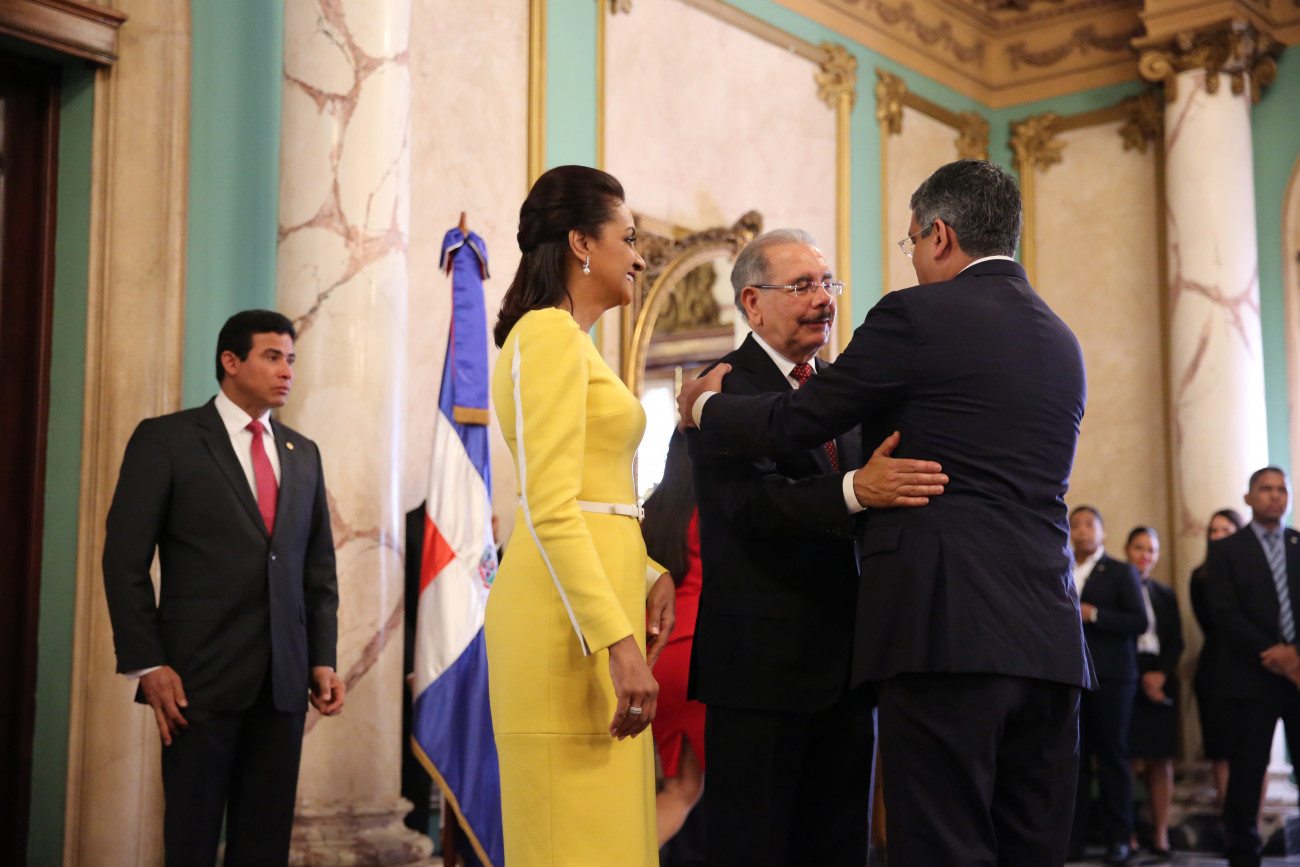 De manera entusiasta y con evidente alegría, el presidente Danilo Medina y la primera dama de la República, Cándida Montilla de Medina, recibieron los saludos de Año Nuevo, en una ceremonia que tuvo lugar en el Salón de Embajadores del Palacio Nacional.