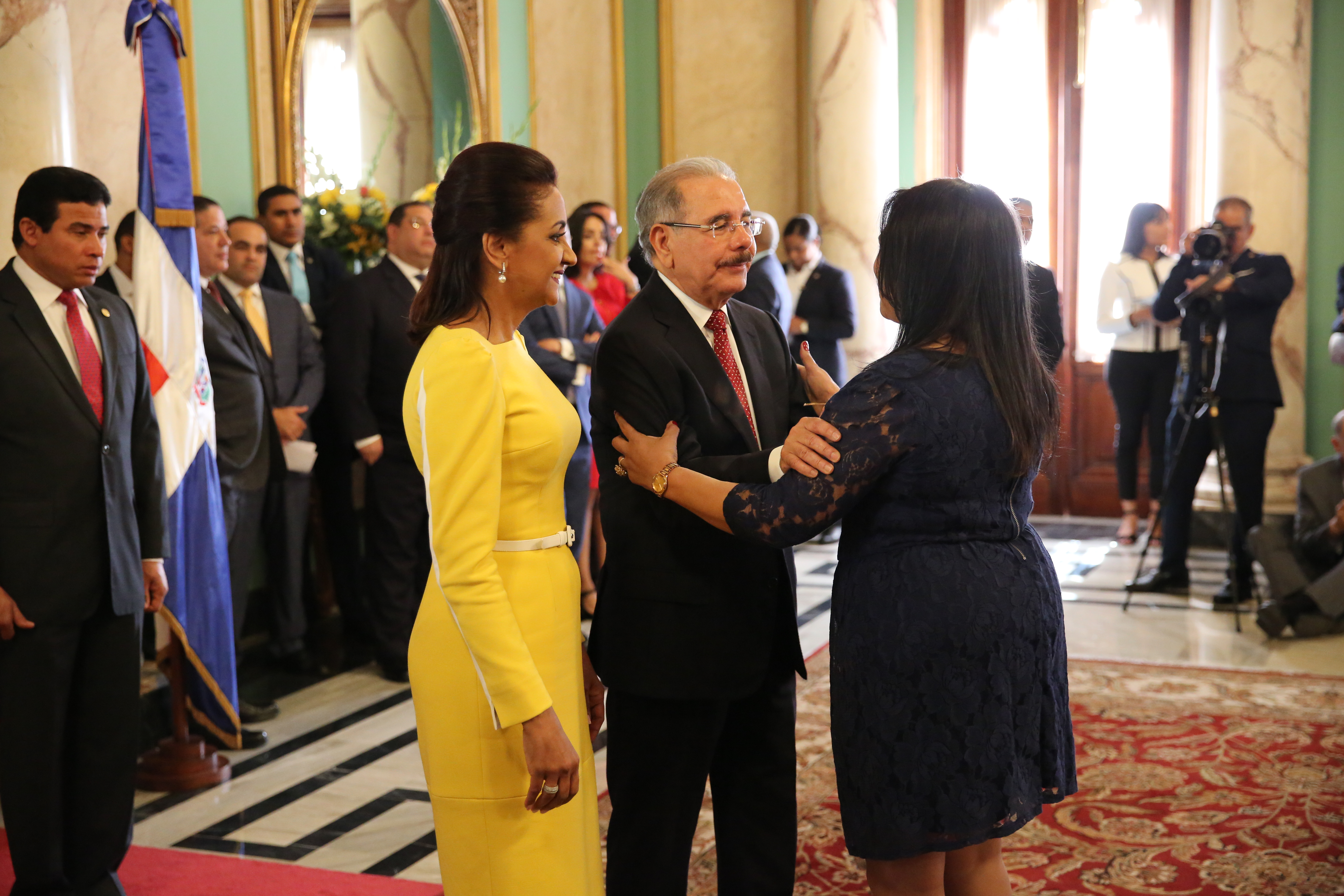 De manera entusiasta y con evidente alegría, el presidente Danilo Medina y la primera dama de la República, Cándida Montilla de Medina, recibieron los saludos de Año Nuevo, en una ceremonia que tuvo lugar en el Salón de Embajadores del Palacio Nacional.