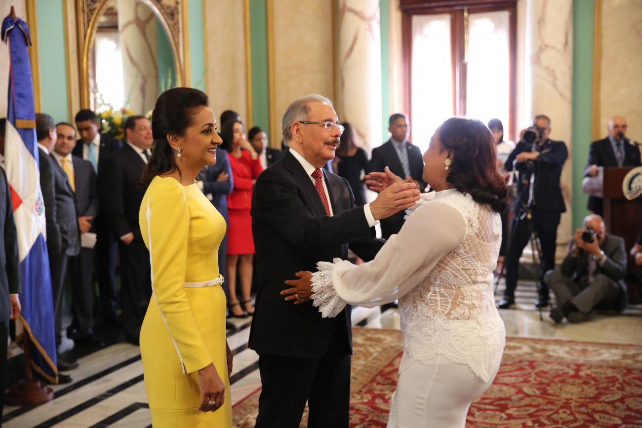 De manera entusiasta y con evidente alegría, el presidente Danilo Medina y la primera dama de la República, Cándida Montilla de Medina, recibieron los saludos de Año Nuevo, en una ceremonia que tuvo lugar en el Salón de Embajadores del Palacio Nacional.