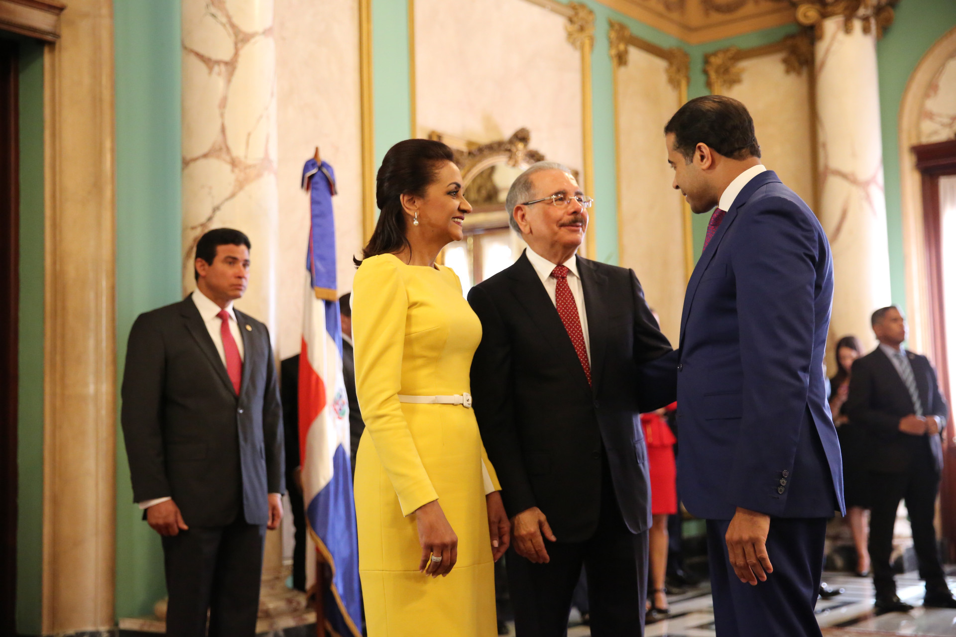 De manera entusiasta y con evidente alegría, el presidente Danilo Medina y la primera dama de la República, Cándida Montilla de Medina, recibieron los saludos de Año Nuevo, en una ceremonia que tuvo lugar en el Salón de Embajadores del Palacio Nacional.