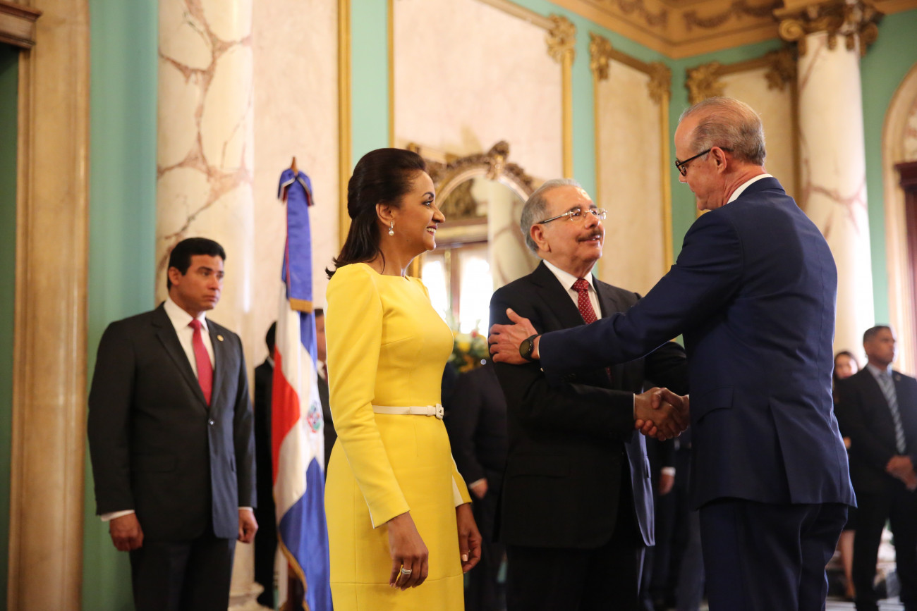 De manera entusiasta y con evidente alegría, el presidente Danilo Medina y la primera dama de la República, Cándida Montilla de Medina, recibieron los saludos de Año Nuevo, en una ceremonia que tuvo lugar en el Salón de Embajadores del Palacio Nacional.