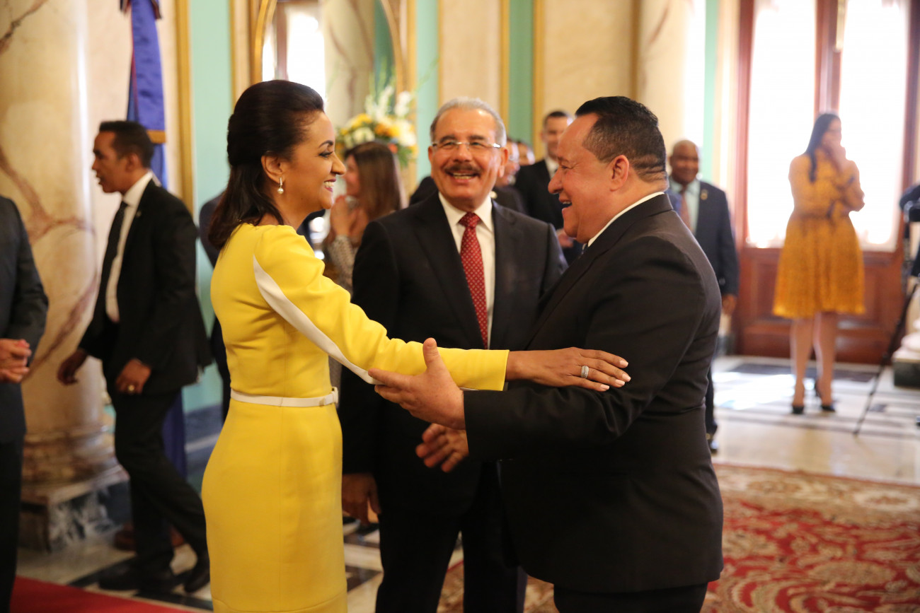De manera entusiasta y con evidente alegría, el presidente Danilo Medina y la primera dama de la República, Cándida Montilla de Medina, recibieron los saludos de Año Nuevo, en una ceremonia que tuvo lugar en el Salón de Embajadores del Palacio Nacional.