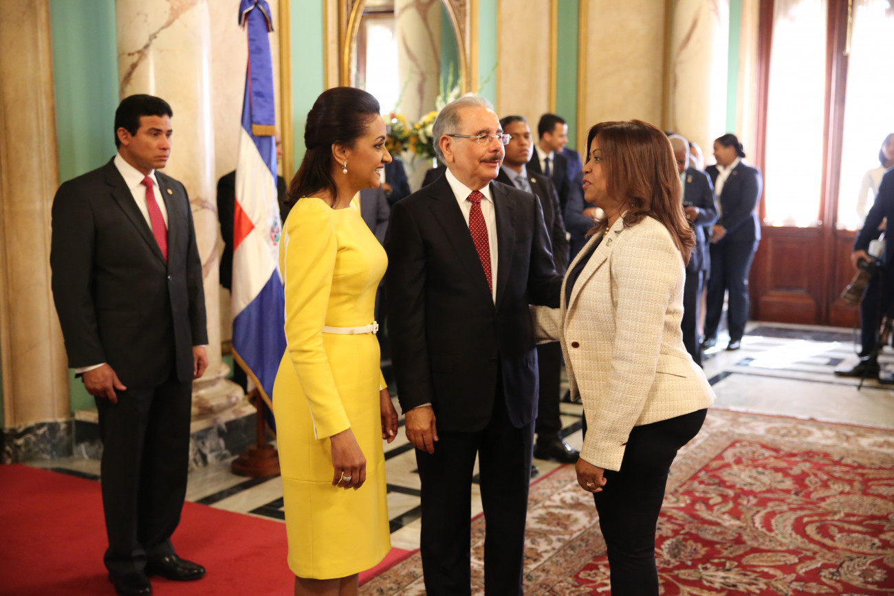 De manera entusiasta y con evidente alegría, el presidente Danilo Medina y la primera dama de la República, Cándida Montilla de Medina, recibieron los saludos de Año Nuevo, en una ceremonia que tuvo lugar en el Salón de Embajadores del Palacio Nacional.