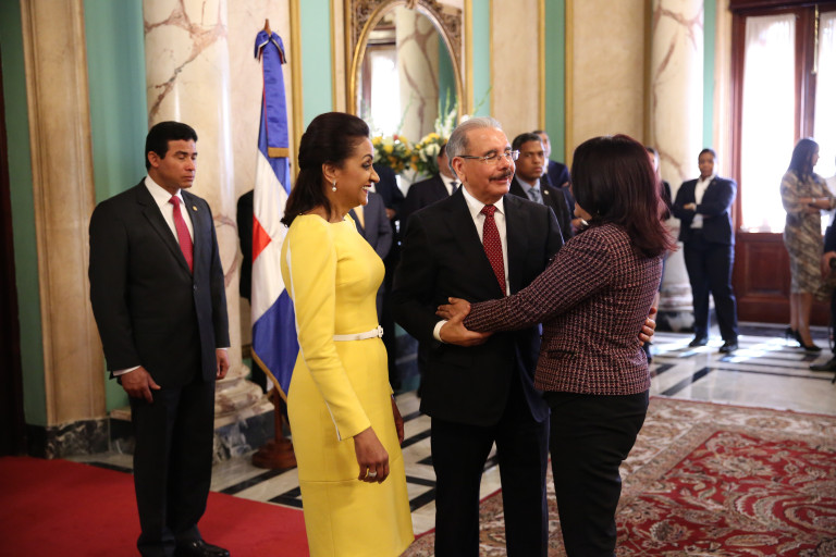 De manera entusiasta y con evidente alegría, el presidente Danilo Medina y la primera dama de la República, Cándida Montilla de Medina, recibieron los saludos de Año Nuevo, en una ceremonia que tuvo lugar en el Salón de Embajadores del Palacio Nacional.