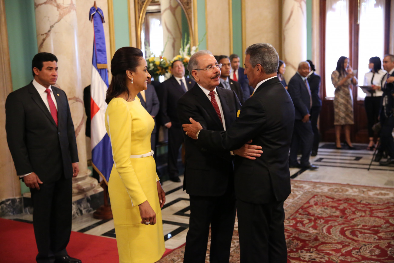 De manera entusiasta y con evidente alegría, el presidente Danilo Medina y la primera dama de la República, Cándida Montilla de Medina, recibieron los saludos de Año Nuevo, en una ceremonia que tuvo lugar en el Salón de Embajadores del Palacio Nacional.