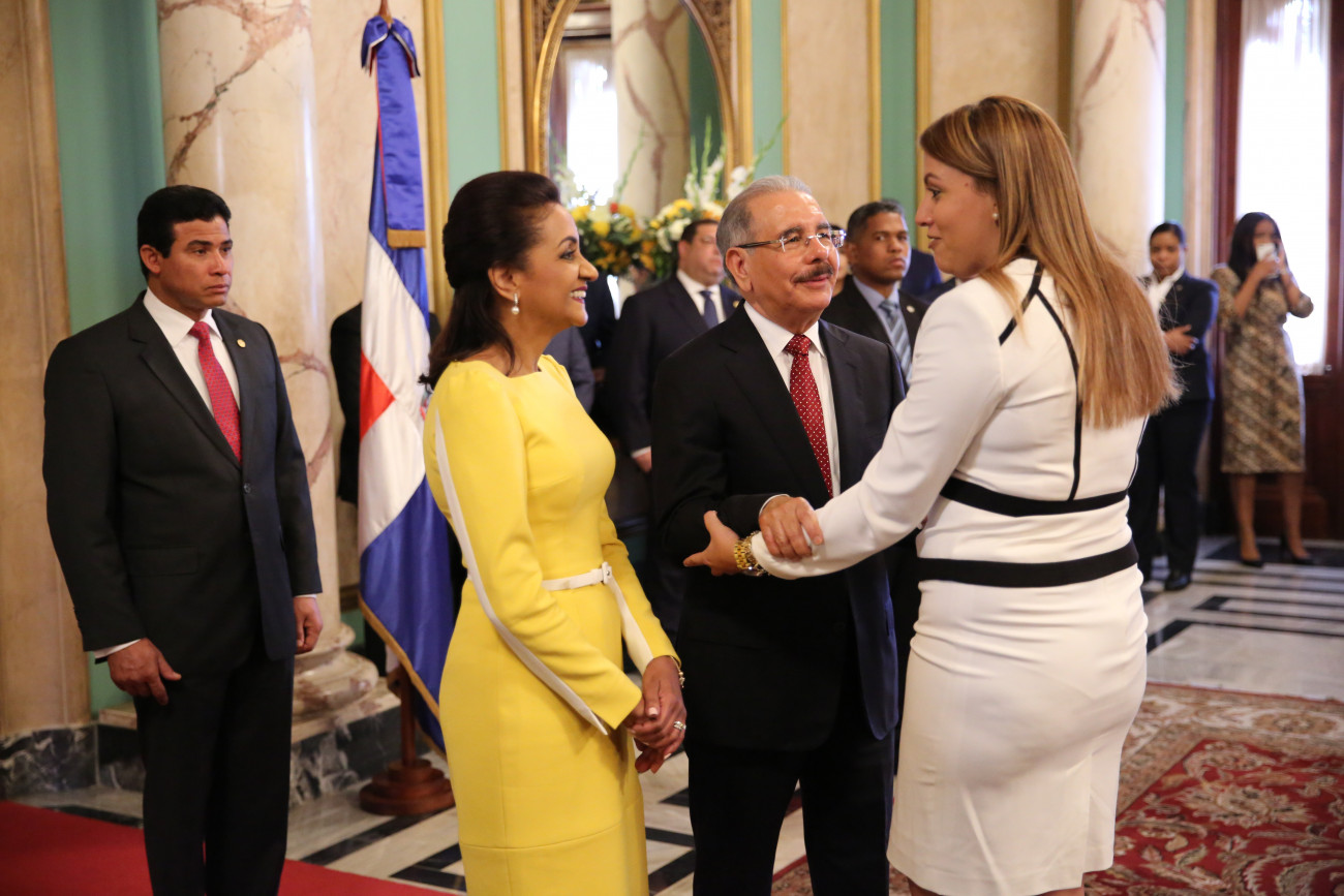 De manera entusiasta y con evidente alegría, el presidente Danilo Medina y la primera dama de la República, Cándida Montilla de Medina, recibieron los saludos de Año Nuevo, en una ceremonia que tuvo lugar en el Salón de Embajadores del Palacio Nacional.