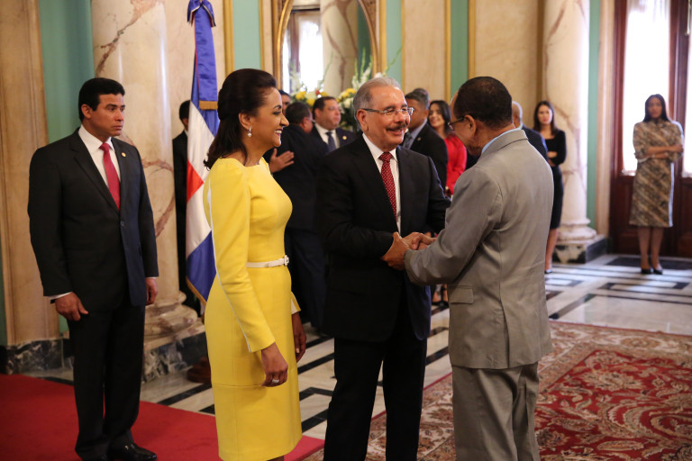 De manera entusiasta y con evidente alegría, el presidente Danilo Medina y la primera dama de la República, Cándida Montilla de Medina, recibieron los saludos de Año Nuevo, en una ceremonia que tuvo lugar en el Salón de Embajadores del Palacio Nacional.