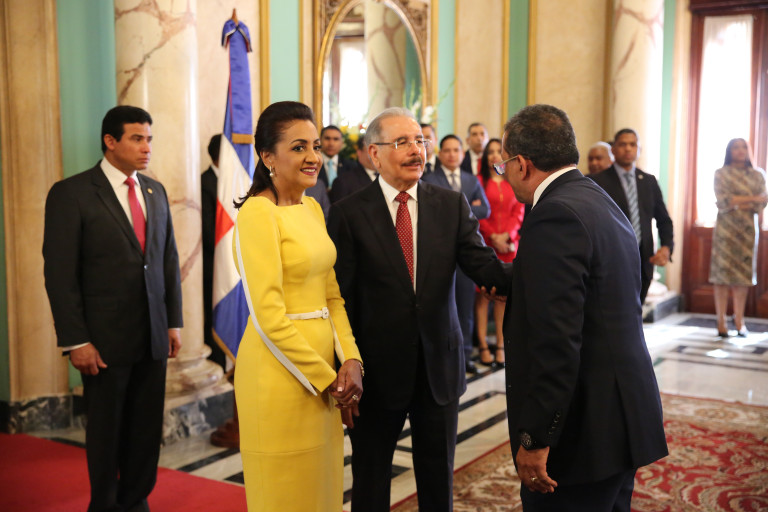 De manera entusiasta y con evidente alegría, el presidente Danilo Medina y la primera dama de la República, Cándida Montilla de Medina, recibieron los saludos de Año Nuevo, en una ceremonia que tuvo lugar en el Salón de Embajadores del Palacio Nacional.