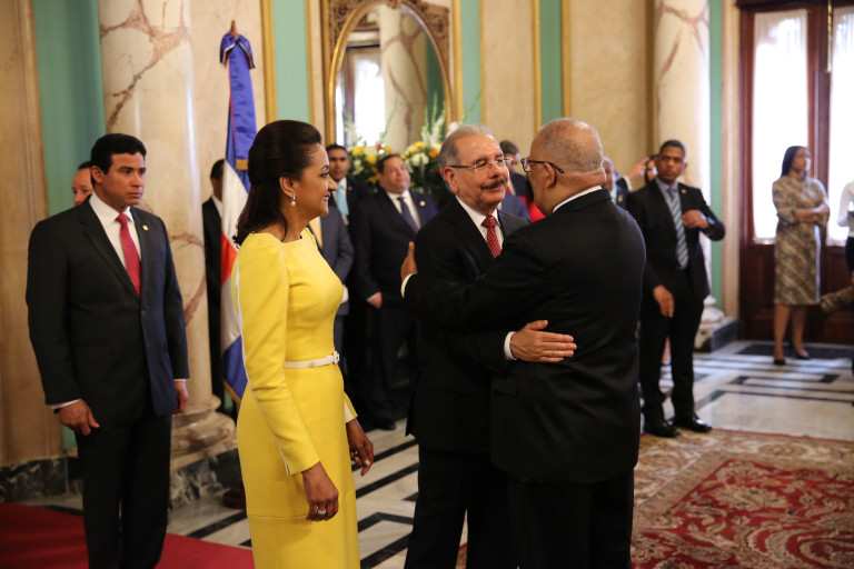De manera entusiasta y con evidente alegría, el presidente Danilo Medina y la primera dama de la República, Cándida Montilla de Medina, recibieron los saludos de Año Nuevo, en una ceremonia que tuvo lugar en el Salón de Embajadores del Palacio Nacional.