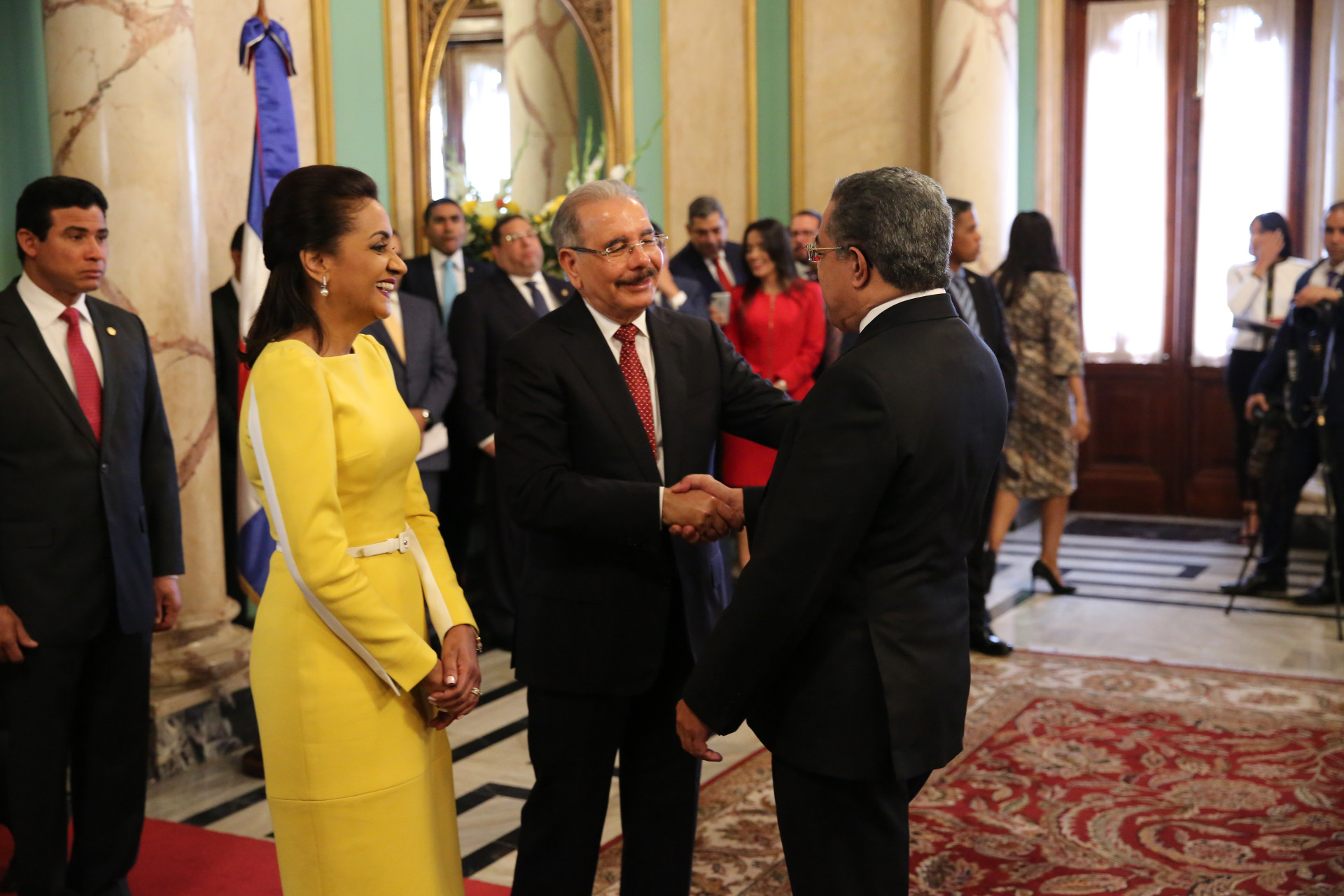 De manera entusiasta y con evidente alegría, el presidente Danilo Medina y la primera dama de la República, Cándida Montilla de Medina, recibieron los saludos de Año Nuevo, en una ceremonia que tuvo lugar en el Salón de Embajadores del Palacio Nacional.