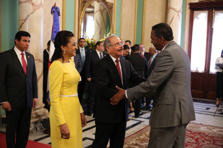 De manera entusiasta y con evidente alegría, el presidente Danilo Medina y la primera dama de la República, Cándida Montilla de Medina, recibieron los saludos de Año Nuevo, en una ceremonia que tuvo lugar en el Salón de Embajadores del Palacio Nacional.