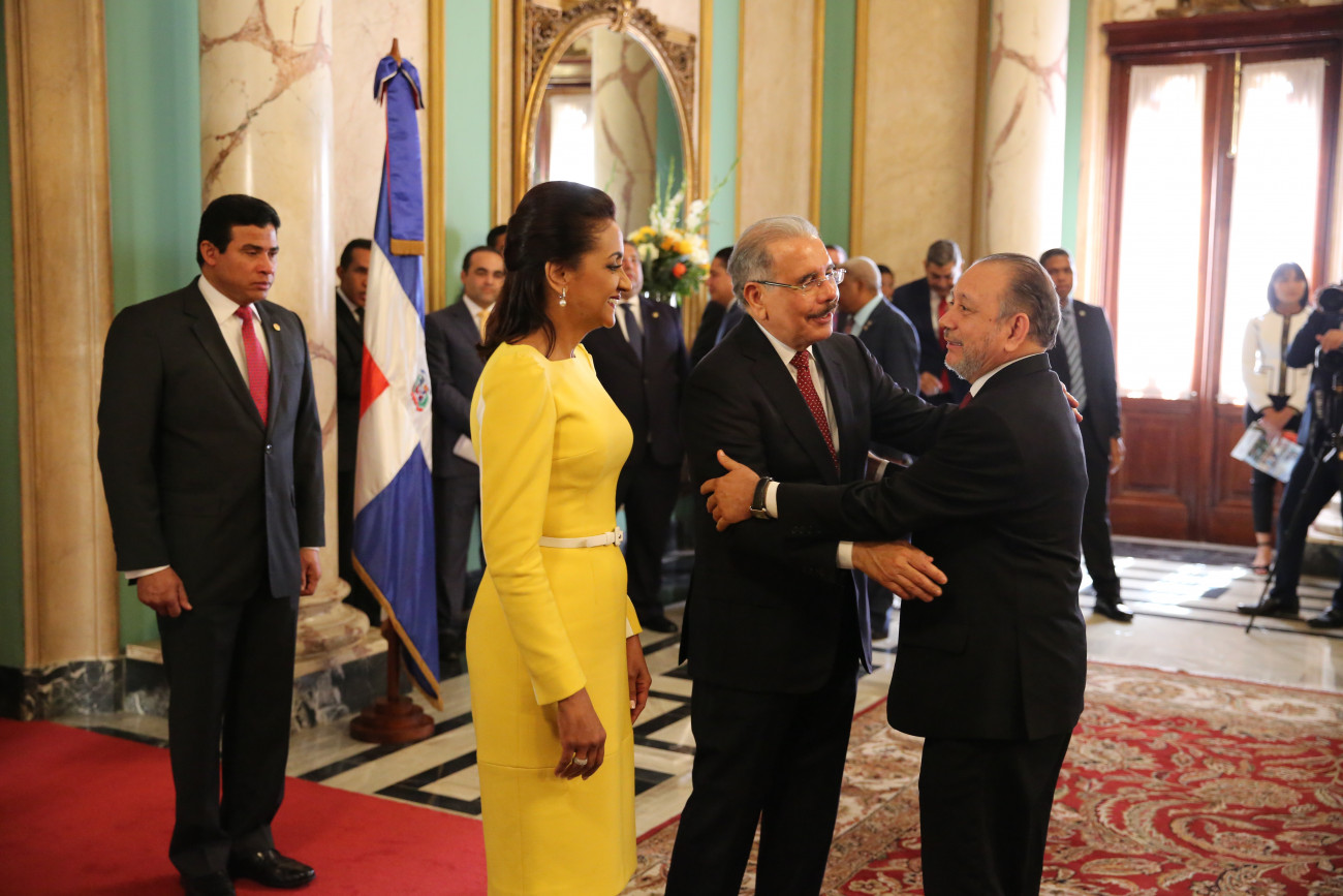 De manera entusiasta y con evidente alegría, el presidente Danilo Medina y la primera dama de la República, Cándida Montilla de Medina, recibieron los saludos de Año Nuevo, en una ceremonia que tuvo lugar en el Salón de Embajadores del Palacio Nacional.