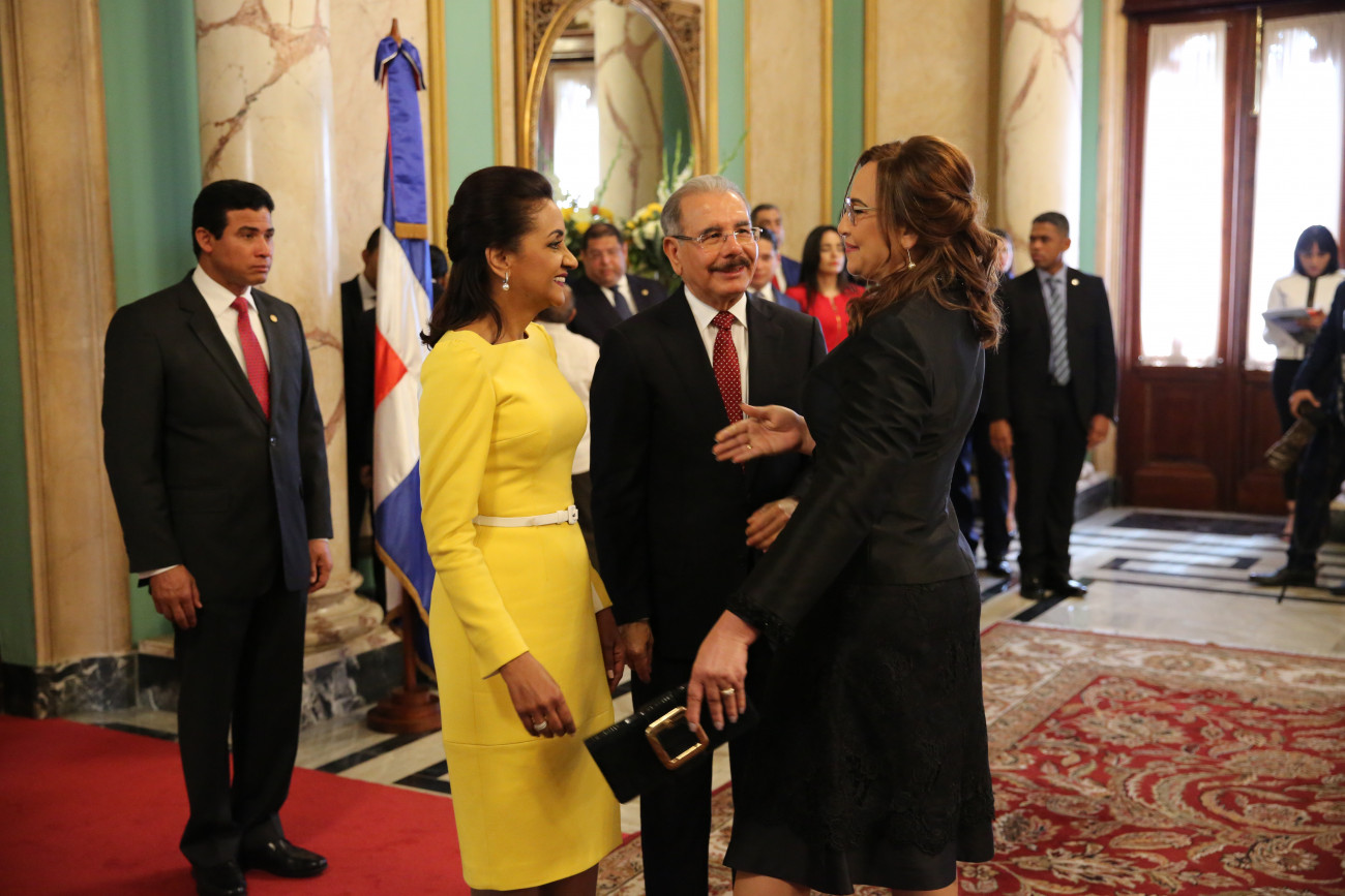 De manera entusiasta y con evidente alegría, el presidente Danilo Medina y la primera dama de la República, Cándida Montilla de Medina, recibieron los saludos de Año Nuevo, en una ceremonia que tuvo lugar en el Salón de Embajadores del Palacio Nacional.