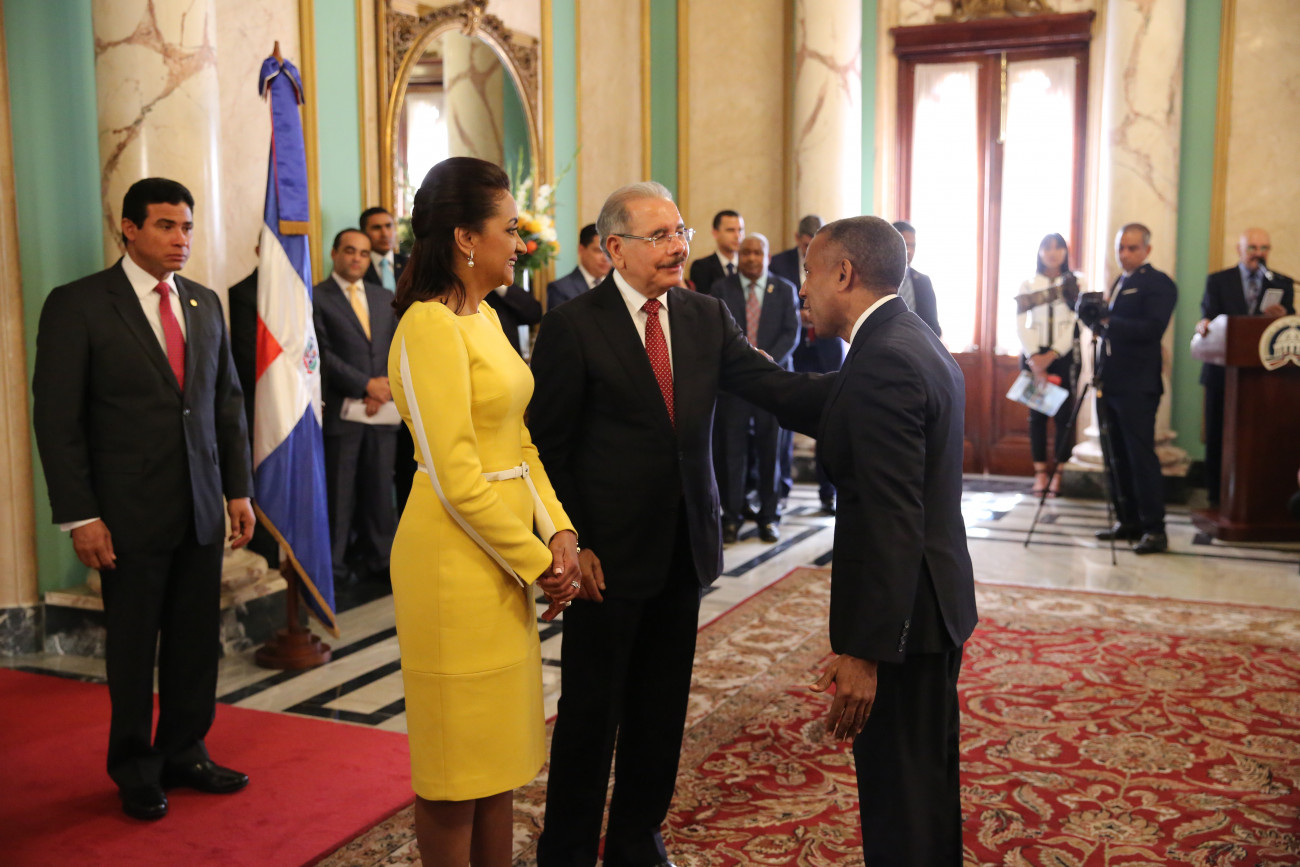 De manera entusiasta y con evidente alegría, el presidente Danilo Medina y la primera dama de la República, Cándida Montilla de Medina, recibieron los saludos de Año Nuevo, en una ceremonia que tuvo lugar en el Salón de Embajadores del Palacio Nacional.