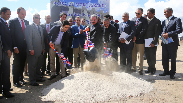 El presidente Danilo Medina dio el primer palazo para dejar iniciado los trabajos de construcción. Le acompañan el director del Instituto Nacional de Recursos Hidráulicos (INDRHI), Olgo Fernández: el ministros Administrativo de la Presidencia, José Ramón Peralta; de Obras Públicas, Gonzalo Castillo; de Industria y Comercio, José del Castillo y Saviñón, el gobernador de la provincia Barahona, Pedro Peña Rubio; el senador de esa localidad, Eddys Mateo Vásquez; diputados, e invitados especiales presente en la actividad.
