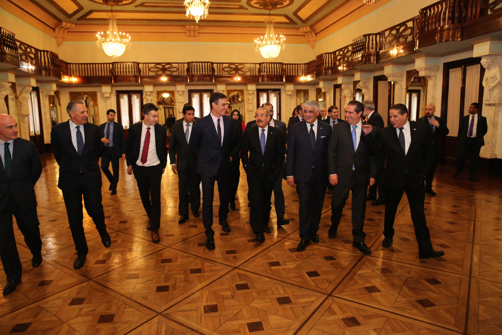 El presidente Danilo Medina y el presidente del gobierno español, Pedro Sánchez, junto a las delegaciones de ambos gobiernos, presentes durante el encuentro.