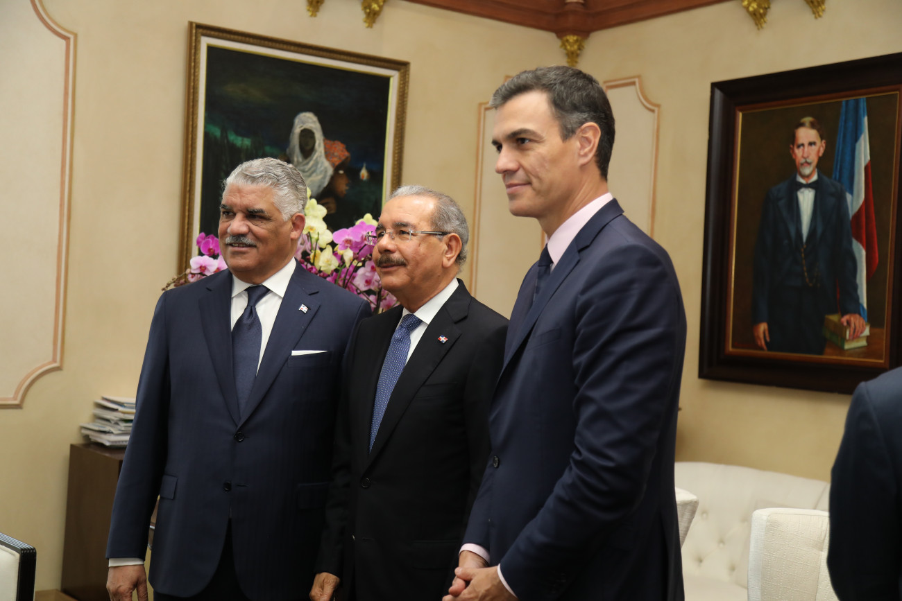 El ministro de Relaciones Exteriores, Miguel Vargas Maldonado, el presidente Danilo Medina y el presidente del gobierno español, Pedro Sánchez, durante su visita oficial a República Dominicana.