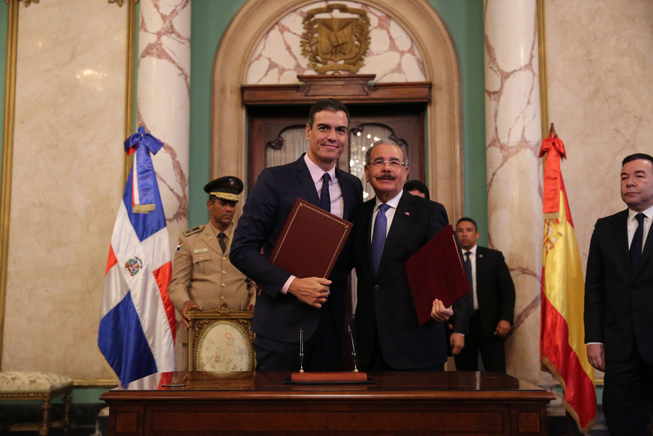 El presidente de la República Danilo Medina y su homólogo de España, Pedro Sánchez, durante la firma de dos acuerdos de cooperación internacional, realizados hoy en el marco de su viaje oficial a República Dominicana.