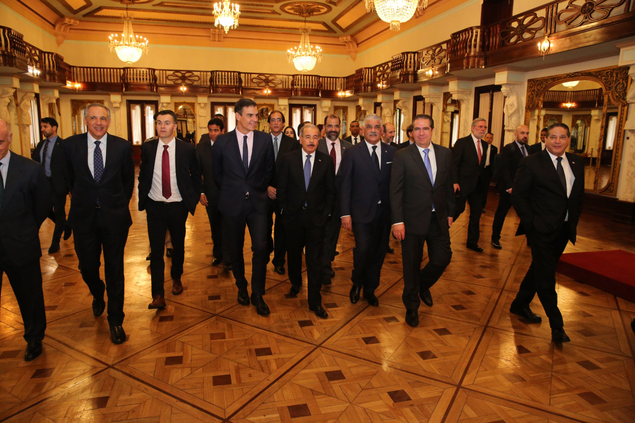El presidente Danilo Medina y el presidente del gobierno español, Pedro Sánchez, junto a las delegaciones de ambos gobiernos, presentes durante el encuentro.