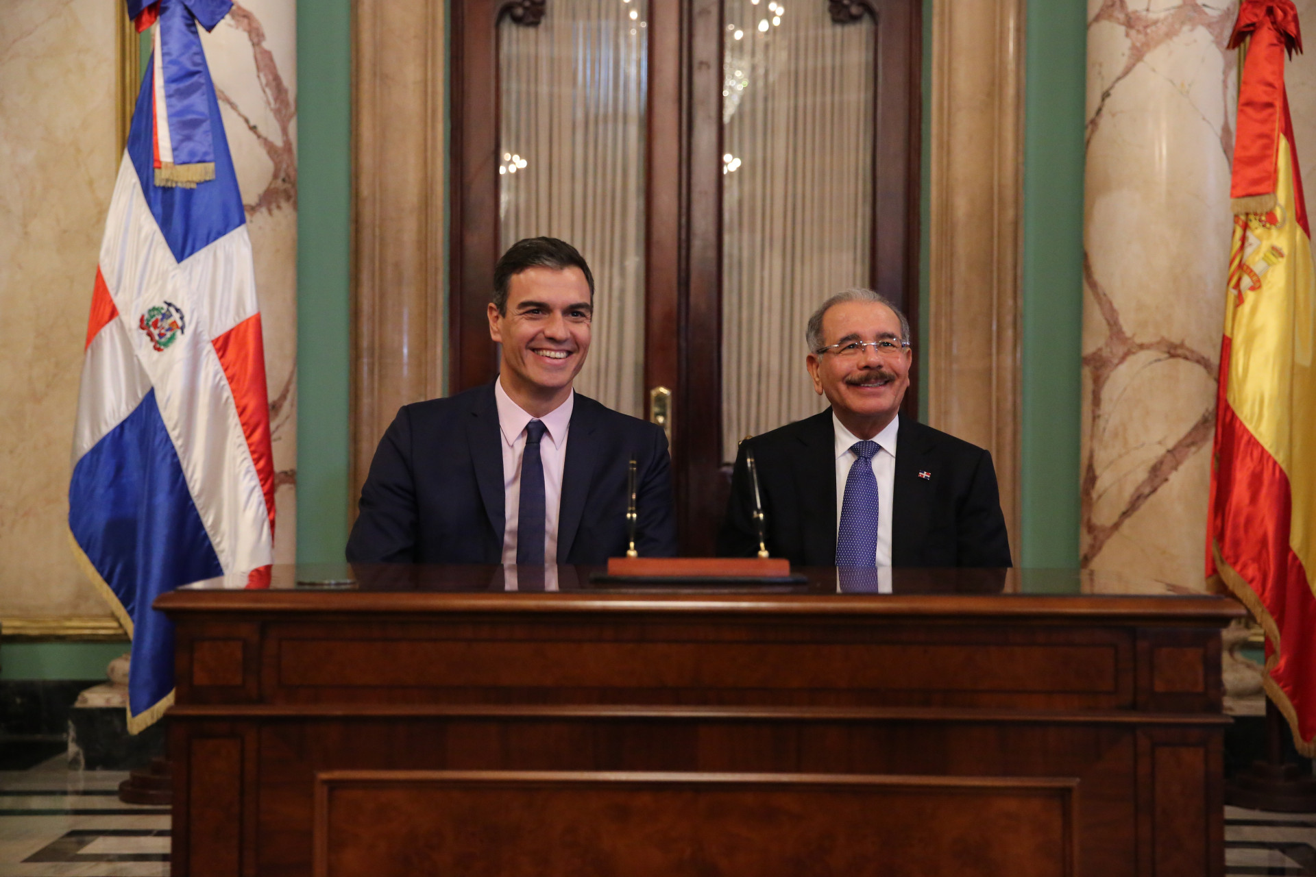 El presidente de la República Danilo Medina y su homólogo de España, Pedro Sánchez, durante la firma de dos acuerdos de cooperación internacional, realizados hoy en el marco de su viaje oficial a República Dominicana.