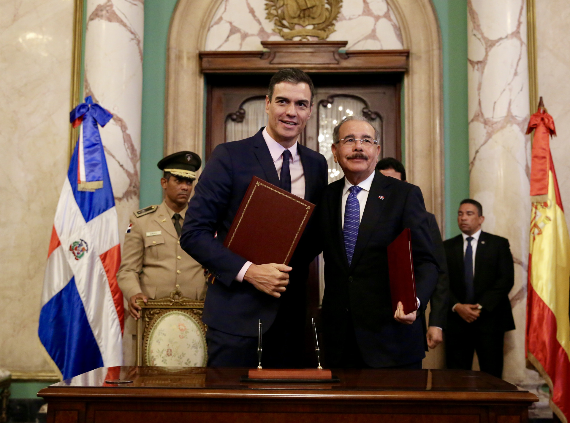 El presidente de la República Danilo Medina y su homólogo de España, Pedro Sánchez, durante la firma de dos acuerdos de cooperación internacional, realizados hoy en el marco de su viaje oficial a República Dominicana.