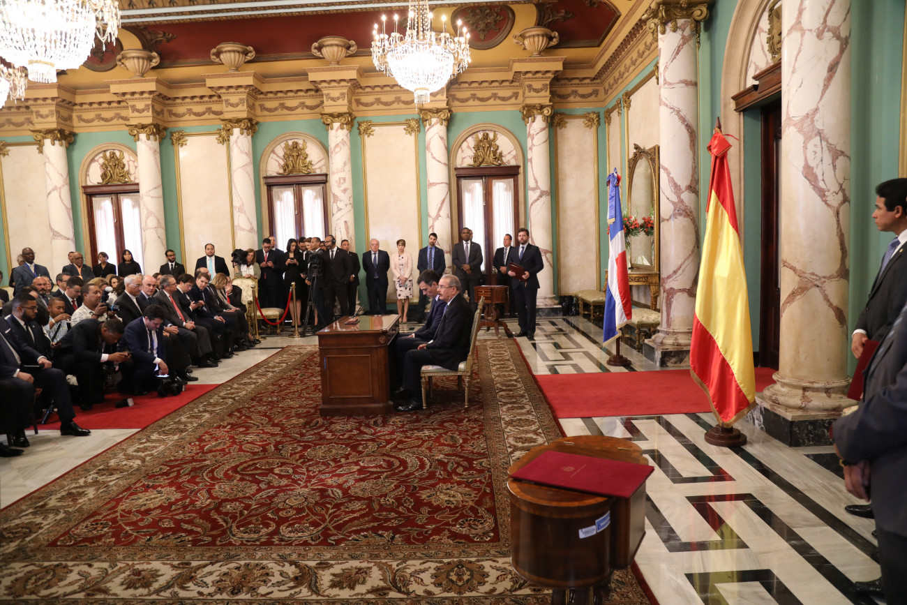 El presidente de la República Danilo Medina y su homólogo de España, Pedro Sánchez, durante la firma de dos acuerdos de cooperación internacional, realizados hoy en el marco de su viaje oficial a República Dominicana.