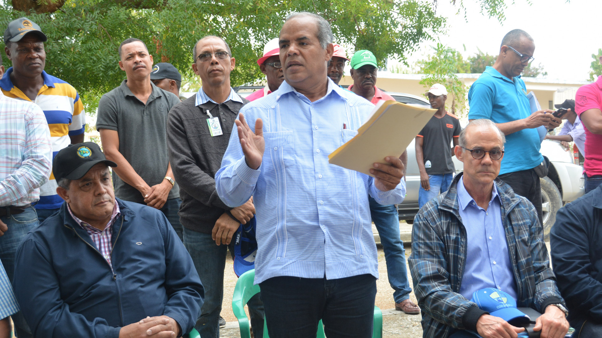 Miembros de la Cooperativa Las Dos Bocas y de la Asociación de Productores Rinconcito durante el acto de entrega de un tractor con su rastra y arado, para promover la siembra de maní, maíz y yuca, en Elías Piña.